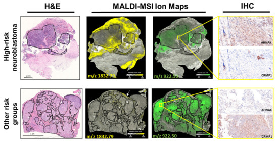 Taken together, MALDI-MSI is feasible for the investigation of molecular cell phenotypes in histologically homogeneous appearing areas of high-risk neuroblastoma. Our data show these cells to be molecularly heterogeneous, and we identified discriminatory peptide signatures for high-risk neuroblastoma. From the discriminatory peptides, 18 could be assigned to 8 proteins, and differential AHNAK and CRMP1 expression was immunohistochemically validated in tissue sections. AHNAK shows intense and distinct staining in the tumor cell-rich regions in high-risk neuroblastomas in comparison to other risk groups (slight staining). In contrast, CRMP1 staining is intense in tumor cell-rich regions of neuroblastomas with other risk designations and only exhibited slight staining in the high-risk group. A detailed analysis of their biological roles in neuroblastoma is warranted.