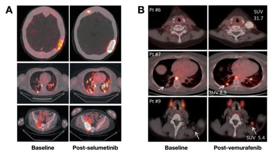 [124I]NaI PET/CT images of patients with RR-DTC or PDTC with or without kinase inhibitors. (A) PET/CT images showed enhanced iodine uptake of lesions post-treatment with selumetinib in nearly all previously negative head, lung, and sacroiliac bone metastases. Reproduced with permission from [35], copyright 2013 Massachusetts Medical Society. (B) PET/CT images showed enhanced radioiodine uptake of lesions in the neck and lung after treatment with vemurafenib, a specific BRAFV600E inhibitor. Reproduced with permission from [36], copyright 2019 Endocrine Society.