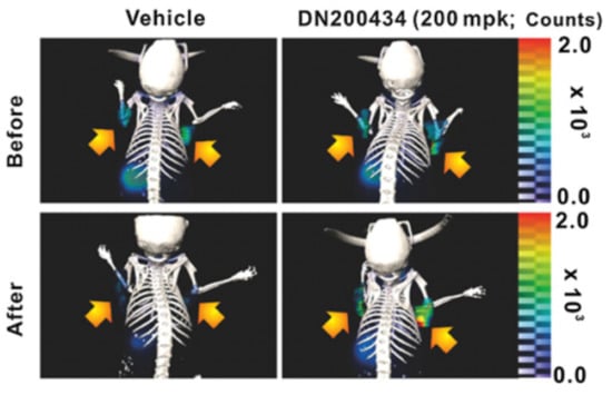 [124I]NaI-PET/CT demonstrates enhanced iodine uptake in CAL62 ATC tumor after treatment with DN200434. The arrows indicate the ATC tumor. Reproduced with permission from [40], copyright 2019 American Association for Cancer Research.