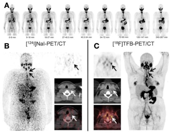 Evaluation of thyroid cancer via [18F]TFB-PET/CT and [124I]NaI-PET/CT. (A) Biodistribution of [18F]TFB at various time points on PET images. [18F]TFB accumulated rapidly in the thyroid and other normal tissues like the salivary gland and stomach within 10–30 min. Reproduced with permission from [50], copyright 2017 Society of Nuclear Medicine and Molecular Imaging. (B,C) A comparison between [124I]NaI-PET/CT and [18F]TFB-PET/CT in a 26-year-old patient post-thyroidectomy. (B) [124I]NaI-PET/CT was unremarkable for PTC. (C) In contrast, [18F]TFB-PET/CT revealed two foci in the left lateral cervical region. Reproduced with permission from [51], copyright 2018 Wolters Kluwer Health.