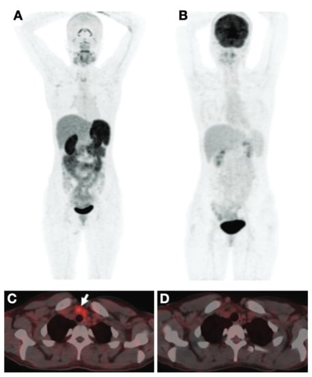 - Nakajo, M.; Nakajo, M.; Kajiya, Y.; Jinguji, M.; Mori, S.; Aridome, K.; Suenaga, T.; Tanaka, S. High FDG and Low FLT Uptake in a Thyroid Papillary Carcinoma Incidentally Discovered by FDG PET/CT. Clin. Nucl. Med. 2012, 37, 607. [Google Scholar] [CrossRef]