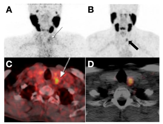 PET/CT imaging comparing [68Ga]Ga-DOTA-RGD2 and [18F]FDG. The RR-DTC case showed a high level of stimulated Tg (85 ng/mL) and negative 131I post-therapy whole-body scan. Histopathology confirmed the metastatic lesions. (A) A maximum intensity projection (MIP) image showed [68Ga]Ga-DOTA-RGD2 positive foci in the lower cervical region. (B) The corresponding MIP image of [18F]FDG. (C) Fused PET/CT showed the metastatic foci was [68Ga]Ga-DOTA-RGD2 positive; (D) the corresponding foci is negative on [18F]FDG fused PET/CT. Reproduced with permission from [85], copyright 2020 Mary Ann Liebert Inc.