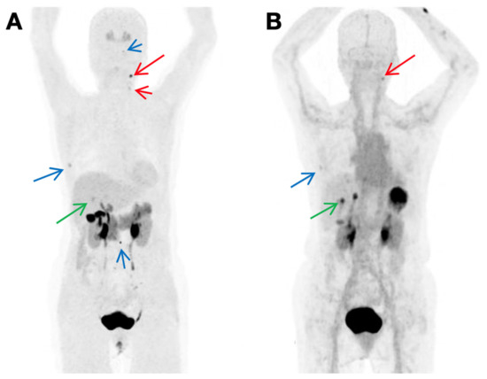 Example of a PTC revealed by [18F]FGln at 10 min (A) and 60 min (B) post-injection, respectively. The arrows indicate the malignant lesion. Reproduced with permission from [62], copyright 2020 Springer Nature Inc.