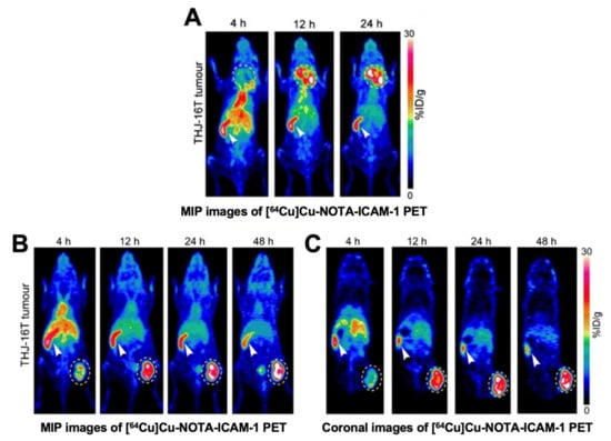 [64Cu]Cu-NOTA-ICAM-1 immunoPET imaging in ATC xenografts (cell line: THJ-16T). (A) Maximum intensity projection (MIP) images in an orthotopic model. (B) MIP images in a subcutaneous model. (C) Coronal images of the same model. Reproduced with permission from [101], copyright 2020 Springer Nature Inc.