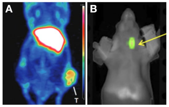 Characterization of [89Zr]Zr-Gal-3 in TC xenografts. (A) PET image acquired at 48 h post radiotracer injection in a subcutaneous TC model showed an apparent accumulation of [89Zr]Zr-Gal-3 in a tumor at the right thigh; Reproduced with permission from copyright 2016 American Association for Cancer Research [124]. (B) TC in an orthotopic model was visualized after injection of Cy5.5-Gal-3 with fluorescence imaging in the neck. Reproduced with permission from [125] copyright 2019 Society of Nuclear Medicine and Molecular Imaging.
