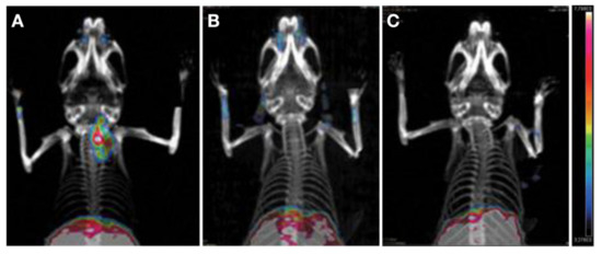 PET/CT images of mice at 24 h after intravenous injections. (A) Injection with 3 MBq of [89Zr]Zr-DFO-αGal3-Fab-PAS200. (B) Co-injection of 3 MBq of [89Zr]Zr-DFO-αGal3-Fab-PAS200 and 1000-fold of nonradioactive aGal3-Fab-PAS200 (for blocking). (C) Control. Color scale bars: 3.3–7.8%ID/g. Reproduced with permission from [139], copyright 2020 Mary Ann Liebert, Inc.