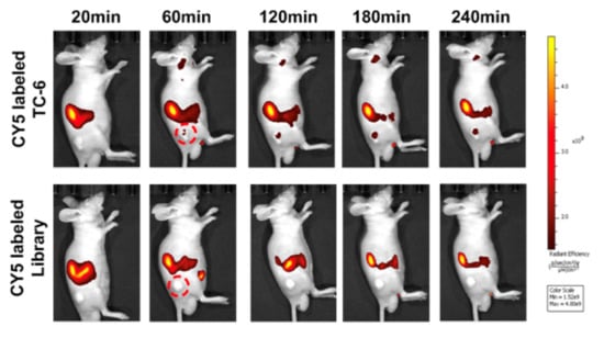 Time-lapse fluorescence imaged post-injection of Cy5-labeled TC-6 (upper) or library control (lower) in a TPC1 xenograft model. Reproduced with permission from [16], copyright 2016 American Association for Cancer Research.