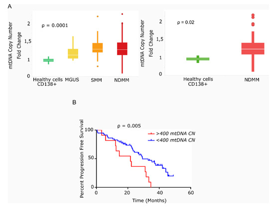 The status of the mtDNACN and its implication in the pathogenesis of cancer is gaining traction [10,11]. These parameters remain, however, relatively unexplored in the context of monoclonal gammopathies and MM, partly because of the inherent difficulties of working with myeloma cells in vitro and partly because of the death of healthy plasma cells in patients with MM. Nonetheless, mtDNA is known to play defining roles during early and late tumor progression in MM [12]. Moreover, mitochondrial biogenesis and activity is often altered in MM due to aberrant gene expression and mutation of mitochondrial-related genes, ultimately contributing to disease progression and relapse, particularly to bortezomib but also to venetoclax [13,14,15,16].