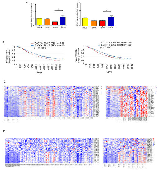 Mitochondrial gene expression is enhanced in late stage multiple myeloma. (A) Fold-change in gene expression of TUFM and TFAM relative to GUSB in patients (MGUS n = 9; SMM n = 9; NDMM n = 18; RRMM n = 11). Data are presented as mean values ± SEM of technical triplicates. (B) High level of mitochondria-related genes identified by RNAseq analysis from the CoMMpass study (IA14); TUFM and COXII overexpression associate with shorter progression-free survival. (C,D) Heatmaps of canEvolve database analysis. (C) Gene-set enrichment analysis of the mitochondrial respiratory chain pathway; normal vs. NDMM, normal vs. RRMM. D. Gene-set enrichment analysis of the cytochrome c oxidase activity pathway; normal vs. NDMM, normal vs. RRMM. * p < 0.05.