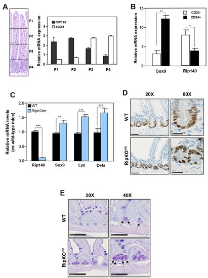 3.1. Rip140 Inhibits Sox9 Expression and Paneth Cell Lineage in Mouse Intestine
