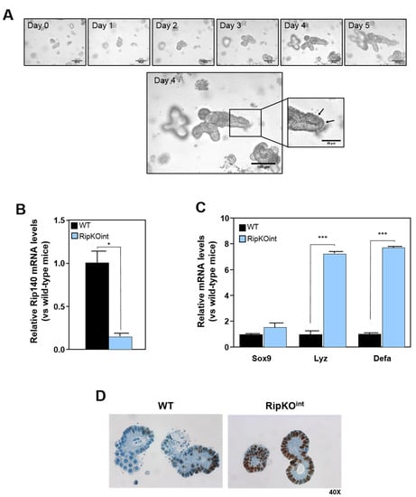 We next determined whether Rip140 knock-out could affect the development of intestinal epithelium ex vivo. For this, we cultured small intestinal organoids from RipKOint and control mice. We performed kinetics to measure the growth efficiency and ability to form budding organoids (Figure 2A). We observed that the development of organoids was optimal at day 4, with the presence of PC in crypt-like structures. In these conditions, we confirmed by RT-qPCR the decrease of Rip140 expression in organoids from RipKOint mice compared to their wild-type littermates (Figure 2B), which was again correlated with a slight increased expression of Sox9 and a significant upregulation of Lyz and Defa genes in RipKOint organoids (Figure 2C). We also observed that RipKOint mice exhibited a significantly increased number of Sox9-positive cells compared to wild-type animals (Figure 2D), confirming that Rip140 regulates Sox9 expression at the protein level and PC differentiation.