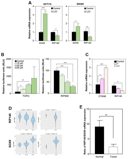 (A) RT-qPCR analysis of RIP140 and SOX9 expression in HCT116 (left panel) and SW480 (right panel) CRC cells after LiCl treatment (50 µM) for 24 h. The results are expressed in arbitrary units after normalization by 28S mRNA levels. Values are the means ± SEM of 3 independent experiments. (B) HCT116 cells were transfected with a β-catenin responsive reporter plasmid (left panel) or with RIP140 gene promoter reporter vector (right panel) and treated with a dose-response of LiCl. Relative luciferase activity was expressed as the mean ± SEM; n = 3. (C) RT-qPCR analysis of RIP140 and CTNNB expression after ectopic expression of TCF and β-catenin. The results are expressed in arbitrary units after normalization by 28S mRNA levels. Values are the means ± SEM of 3 independent experiments. (D) Analysis of RIP140 and SOX9 mRNAs expression in non-tumoral (N), CRC-adjacent non-tumoral tissues (N Adj), and CRC specimens in two different cohorts (GSE44076 on the left panel and GSE39582 on the right panel) using the CANCERTOOL database. Data are presented as violin plots showing the expression of the gene of interest (p-values are indicated). The Y-axis represents the Log2-normalized gene expression. (E) RIP140 and SOX9 mRNA levels expressed in arbitrary units (AU) after normalization to actin mRNA levels in 24 matched normal and tumor colon samples (means ± SEM). A Student t test was used for statistical analysis: * p < 0.05, ** p < 0.01 and *** p < 0.001.