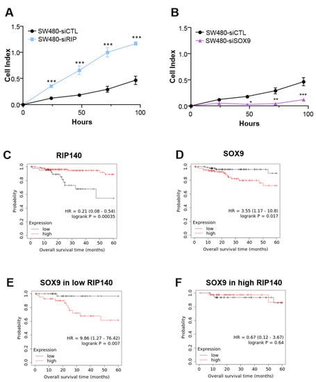 Cell index corresponding to the number of SW480 CRC viable cells, without (SW480 -control) or with siRNA-mediated knock-down of (A) RIP140 (SW480 -siRIP) or (B) SOX9 expression (SW480-siSOX9) A Student t test was used for statistical analysis: * p < 0.05, ** p < 0.01, and *** p < 0.001. (C,D) Kaplan-Meier analysis performed on TCGA RNA-seq data using the Kaplan–Meier plotter database. Patients were ranked according to RIP140 (C) or SOX9 (D) gene expression in their tumors and divided into two groups exhibiting low and high expression, respectively (best cut-off threshold). (E,F) Kaplan-Meier analysis of the cumulative OS of patients with low or high SOX9 gene expression (same cut-off used in panel (D) was performed on the groups exhibiting low or high RIP140 gene expression. A log-rank test was used for statistical analysis.