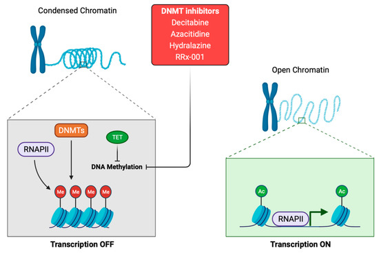 Schematic representation of the DNA methylation process. DNMTis inhibits DNA methylation by downregulation of DNMTs. The action of DNA methylation inhibitors (DNMTs inhibitors and TET proteins) triggers a chromatin-remodeling process and chromatin structure becomes transcriptionally accessible to RNA polymerase II, which will begin the transcription process. DNMTis: DNA methyltransferases inhibitors. DNMTs: DNA methyltransferases. TET: ten-eleven translocation proteins. RNAPII: RNA polymerase II. Me: methyl. Ac: acetyl.