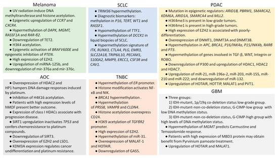Summary of the most representative epigenetic modifications of most aggressive solid tumors observed in adulthood. UV: ultraviolet. SCLC: small-cell lung cancer. PDAC: pancreatic ductal adenocarcinoma. AOC: advanced ovarian cancer. TNBC: triple-negative breast cancer. GBM: glioblastoma.