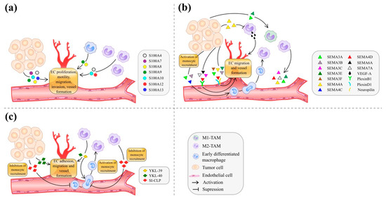 The role of TAM-produced soluble mediators of cell-cell interactions in tumor angiogenesis. They include the members of S100A family (a), of SEMA family (b) and of chitinase-like protein family (c).