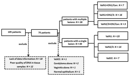 In the present study, for convenience the former term, VaIN is used for vaginal squamous intraepithelial lesion (VaSIL), and CIN is used for cervical SIL. One hundred and five patients diagnosed with VaIN and VaSCC, who visited the department of Obstetrics and Gynecology of the Kanazawa Medical University Hospital from 2011 to 2020, were analyzed in this study (Figure 1). All samples were randomized based on the demographic information of all patients. Patients having anal, vulvar, and cervico-vaginal condyloma as the predominant lesion were excluded in this study. All subjects agreed to the use of their cell or histology specimen for this study prior to surgery, according to the protocols approved by the Ethics Committee of Kanazawa Medical University. In total, 12 cases with no or too few histology samples or cell samples and 18 cases with a lack of information were excluded; therefore, 75 patients were evaluated. One pathologist and one surgical pathologist confirmed the diagnosis for each specimen according to the WHO classification [23]. If the diagnosis did not coincide, a final diagnosis was determined via agreement between two pathologists.