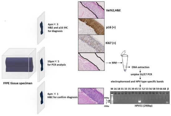 The FFPE blocks for each case were sectioned according to the following procedure: three slices of 4 μM sections were used for histopathological diagnosis after haematoxylin and eosin (H&E) staining, followed by expression of p16 and Ki67 after immunohistochemical (IHC) staining; five slices of 10 μM sections were used for DNA extraction and HPV genotyping; and the final 4 μM section was used for histological evaluation with H&E staining to confirm if the target lesion remained. The microtome was cleaned with 70% alcohol and the blade was replaced for cutting following each tissue block to avoid contamination of HPV in other samples (Figure 2). The tissue slices were placed on individual glass slides that were stored in a refrigerator at −20 °C until DNA extraction.