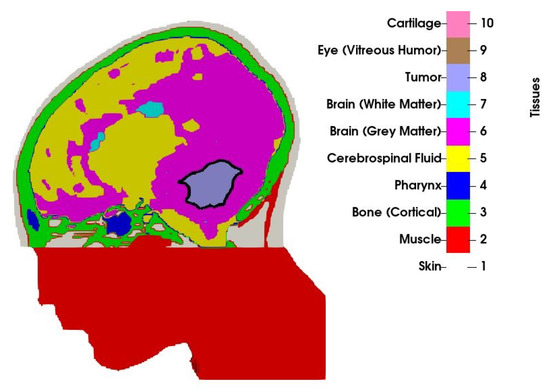 An MRI scan with a mm resolution was obtained from a 13-year old boy with medulloblastoma. The scan was manually segmented by a clinician into 10 tissue types, as visualized in Figure 1. Only a part of the head was segmented, and the section outside the treatment volume, that is, the part of the head below the tumour that was not covered by the applicator was modelled as muscle. Observe that the volume of the original tumour, as studied in [31], has been reduced to by means of morphological operations (erosion). The volume no longer occupied by the tumour has been filled with a mirrored copy of the opposite healthy brain hemisphere to preserve the anatomical correctness. In the context of the current proof-of-concept study, this may be considered a valid model for various residual brain tumours, such as medulloblastomas or ependymomas.