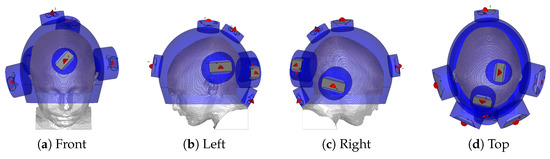 The antenna arrangement within the applicator is obtained via a global optimization procedure based on a specific absorption rate (SAR) that, conjointly for each antenna, determines the location and polarization angle to minimize the hot-spot to target quotient (HTQ) [40]. The procedure has been introduced in [41] and subsequently extended for use with the non-linear cost function HTQ and for the multi-frequency ultra-wideband (UWB) range adopted in this study. The steering parameters, that is, the phase and amplitude of each antenna at each operating frequency, are obtained via particle swarm optimization [42], using the HTQ as the cost function. The final antenna arrangement is visualized in Figure 2. The temperature distribution is then obtained by scaling the power deposition until the threshold for thermal damage in healthy brain temperatures () [43] is reached. The temperature of the water bolus is set to . The quality and feasibility of the treatment plan are evaluated in terms of the indexed temperatures , and , which represent the temperatures achieved in 10, 50, and 90% of the target volume, respectively.
