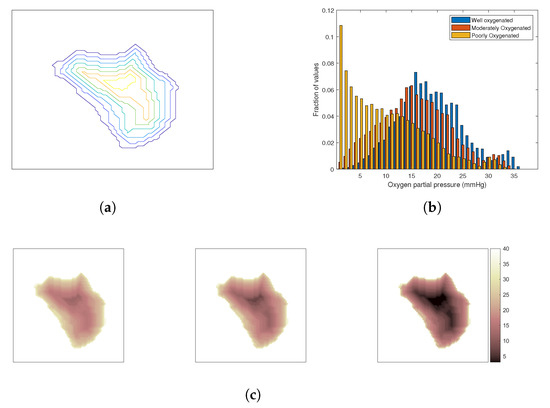 Modelling of the oxygenation level in the tumour. (a) A transverse cut of the iso-contour from the surface of the tumour. (b) Clinically representative histograms of for a generic tumour under three different hypoxic conditions. (c) Mapped distribution for those that are well-, moderately-, and poorly-oxygenated, respectively, from left to right.