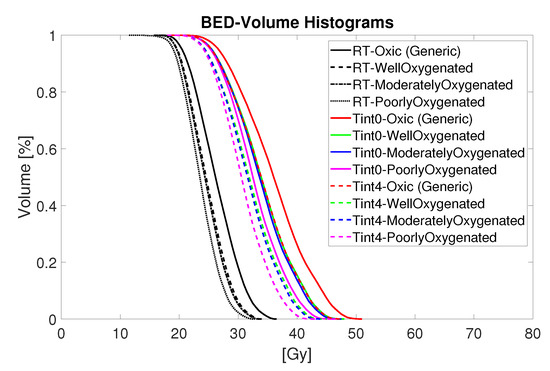 Figure 5 summarizes in detail the estimated biological effective radiation dose of the combined thermoradiotherapy treatment plan (RT + HT) achieved for different oxygenation conditions and sequential administration. The black lines represent the results for radiation only, while the coloured lines represent the combined treatment administered with time interval 0 (solid coloured lines) and 4 h after irradiation (dashed coloured lines). Although the results suggest a noticeable increase in the BED values for all levels of oxygenation, the administration of HT directly after RT, that is, , yields a bigger boost for each oxygenation level. Furthermore, the highest BED is observed for the oxic population, followed by the estimated BED for well-, moderately-, and poorly-oxygenated scenarios.