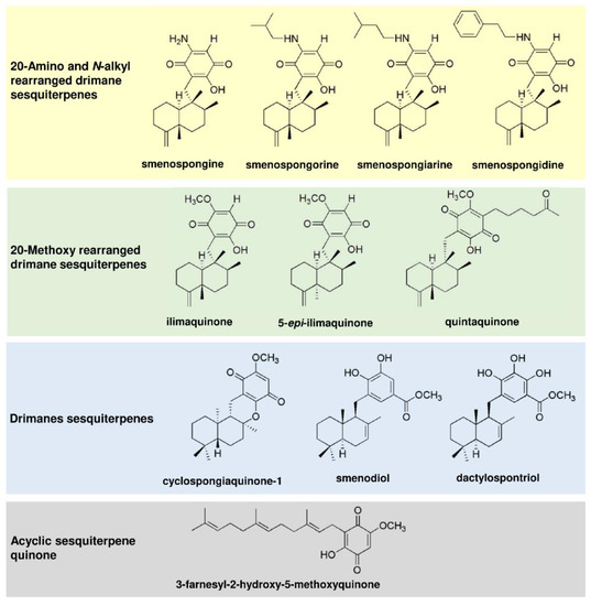 - Kondracki, M.-L.; Guyot, M. Biologically active quinone and hydroquinone sesquiterpenoids from the sponge smenospongia sp. Tetrahedron 1989, 45, 1995–2004. [Google Scholar] [CrossRef]