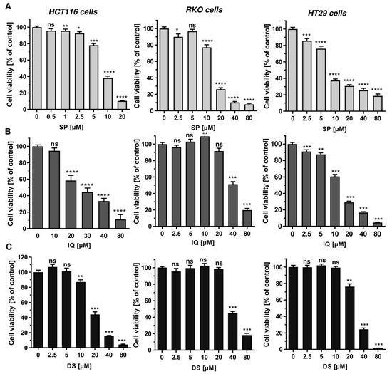 Cytotoxicity of selected merosesquiterpenes in CRC cell lines: (A–C) CRC cells (HCT116, RKO, HT29) were treated with increasing concentration of SP (panel A), IQ (panel B) and DS (panel C) for 72 h. Viability was determined using a luminescent ATP test. Data are presented as mean + SEM (n = 3). Not significant (ns): p > 0.05; * p < 0.05; ** p < 0.01; *** p < 0.001; **** p < 0.0001.