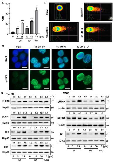 Induction of DNA strand brakes and DNA damage response in CRC cells after treatment with merosesquiterpenes: (A) HCT116 cells were treated with SP or IQ as indicated for 24 h. The anticancer drug etoposide was included as positive control. DNA strand break induction was determined by the alkaline Comet assay. Data are presented as mean + SEM (n = 3). ** p < 0.01, *** p < 0.001; (B) representative images of Comet assay shown in A; (C) HCT116 cells were treated as described in (A). Formation of the DNA damage marker γH2AX was visualized by immunofluorescence microscopy. Nuclei are depicted in blue, while γH2AX is shown in green. Representative pictures are displayed. Scale bar: 10 µm; (D) HCT116 cells were treated with SP or IQ, as indicated, for 24 h. The anticancer drug 5-FU was included as positive control. Samples were analyzed by SDS–PAGE and Western Blot detection of γH2AX, p-CHK1, p53, and p21. Hsp90 served as loading control. Representative blots are shown together with the densitometry evaluation.