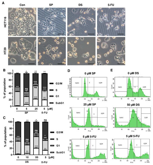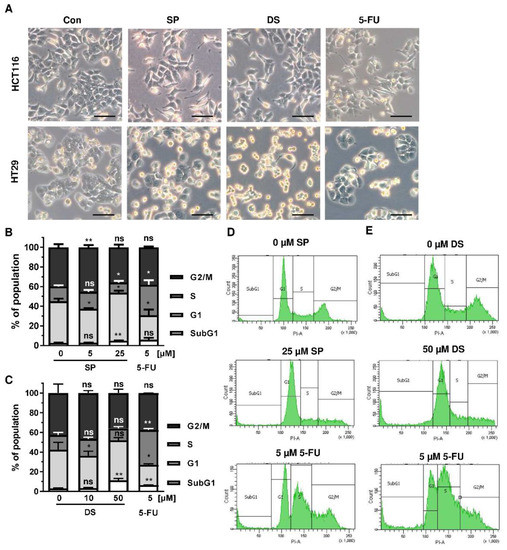 We then analyzed how prolonged exposure to SP and DS over 48 h affects morphology and cell cycle distribution in HCT116 and HT29 cells. Microscopy revealed drastic morphological changes with increased cell rounding and detachment of cells, strongly suggesting cell death induction (Figure 5A). In agreement with these observations, SP and DS caused a huge increase of the subG1 population in HCT116 cells at high concentrations (Figure 5B–E), which was also detected in HT29 cells (Figure A3A–D). Treatment with lower concentrations of both compounds induced a pronounced G2-M arrest in the tested CRC cell lines. Interestingly, the positive control 5-FU exerted also potent cytotoxic effects in HCT116 cells (Figure 5), whereas 5-FU had little impact on HT29 cells, as attested by lack of subG1 (Figure A3).