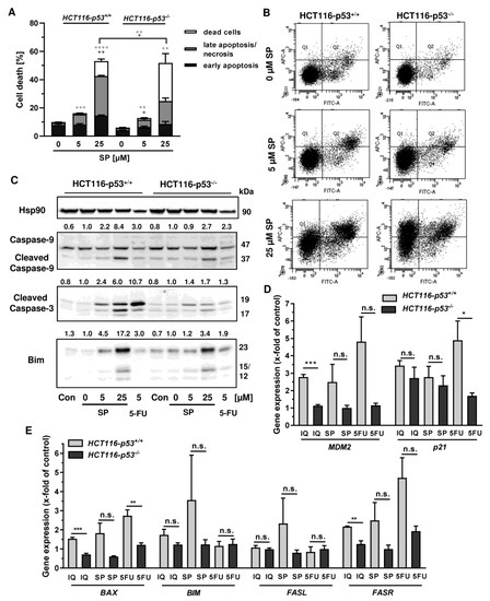 Impact of p53 status on anticancer drug triggered cell death in CRC cells: (A) isogenic HCT116-p53+/+ and HCT116-p53−/− cells were exposed to 5 µM 5-FU and 5 µM Etoposide (Eto) for 48 h. Cell death induction was assessed by Annexin V-FITC/PI staining and flow cytometry. Data are shown as mean + SEM (n = 3). Not significant (ns): p > 0.05; * p < 0.05; ** p < 0.01; (B) representative dot plots of measurements performed in (A). (C) Morphological changes in HCT116-p53+/+ and HCT116-p53−/− cells challenged with 25 µM SP for 48 h.