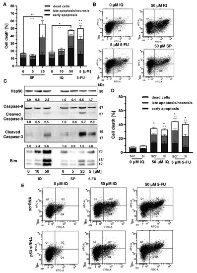 Since both Annexin/PI staining and analysis of cell cycle distribution indicated apoptosis induction by SP, the cleavage of the caspase-3 and caspase-9 was assessed by Western blot detection. The experiments demonstrated a concentration-dependent cleavage of both caspases upon SP treatment, which was strongly attenuated in p53-deficient HCT116 cells, particularly for caspase-9 (Figure 6C). Similar to this finding, caspase-9 cleavage by 5-FU treatment was completely blocked in HCT116 p53 k.o. cells (Figure 6C). IQ also caused caspase-9 and caspase-3 cleavage, which was much more prominent in HCT116 cells with p53 expression (Figure A5A). Furthermore, the proapoptotic BH3-only protein Bim was analyzed, revealing a concentration-dependent increase in HCT116 p53 WT cells upon both SP and IQ treatment (Figure 6C and Figure A5A). This effect was strongly attenuated in HCT116 p53 k.o. cells. Interestingly, the p53 status had no impact on Bim levels after challenge with 5-FU, which were found moderately elevated in both isogenic HCT116 cell lines (Figure 6C and Figure A5A).