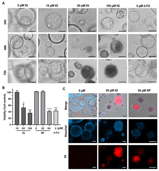 Finally, we translated our findings to a murine tumor organoid model. Tumor organoids were exposed to increasing concentrations of SP and IQ for up to 72 h, and 5-FU was included as the positive control. While low concentrations of the merosesquiterpenes had no impact on tumor organoid morphology and viability, higher concentrations caused substantial morphological alterations already after 24 h, culminating in complete disruption of tumor organoids after 72 h (Figure 8A, top vs. bottom panel).