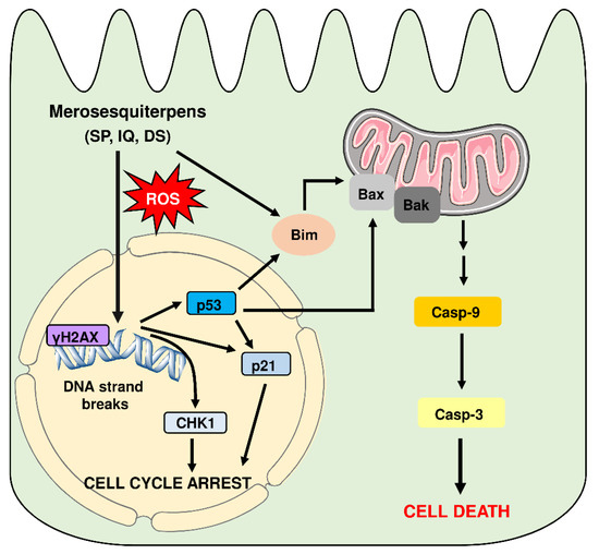 Model of cell death induction triggered by genotoxic merosesquiterpens and involved key players. Merosesquiterpenes cause DNA strand break formation in CRC cells with a concomitant ROS production. This results in the activation of the DNA damage response, as attested by γH2AX formation, CHK1 phosphorylation, and accumulation of p53 and p21. Notably, p21 induction is also observed in p53-mutant CRC cells after exposure to merosesquiterpenes. Activation of p21 and CHK1 causes initial cell cycle arrest. In CRC cells with expression of WT p53, the tumor suppressor protein activates a cell death program by upregulation of Bax, FasR, and Bim as the main proapoptotic factors, as demonstrated in isogenic p53 knockout cells. This finally results in mitochondrial apoptosis via caspase-9 and caspase-3 in p53 WT CRC cells after treatment with merosesquiterpenes. Interestingly, induction of the cell cycle regulator p21 occurs independently of the p53 status, as attested in CRC cells with mutant p53 and p53 knockout. Another important finding is that Bim induction and mitochondrial cell death are also executed in p53-mutated CRC cells after treatment with merosesquiterpens. This figure was created using Servier Medical Art templates, which are licensed under a Creative Commons Attribution 3.0 Unported License; https://smart.servier.com, accesse on 18 May 2021.