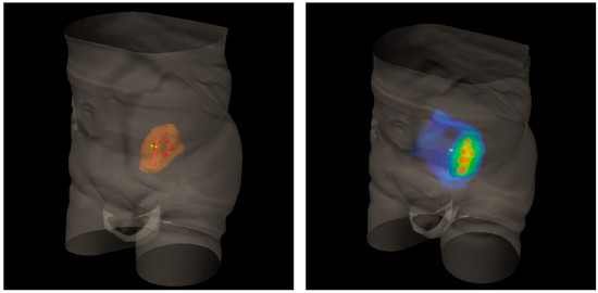 Three-Dimensional (3D) rendering of bulky metastatic iliac lymph node packets from urothelial bladder cancer in a patient candidate for a salvage pelvic radiotherapy (on the left). On the right, 3D dose distribution with a lattice simulation approach. Blue is for the conventional standard dose, red for high peak ones.