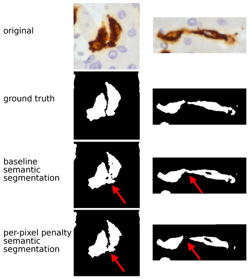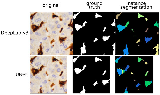 Briefly, the UNet and the SegNet were used at the beginning of the study to establish a baseline, in keeping with previous studies [3,30]. They showed high IoU ( and , respectively) and low SBD ( and , respectively) values. As shown in Figure 1, the baseline semantic segmentation was able to separate TAMs from the background but inadequate to separate adjacent TAMs.
