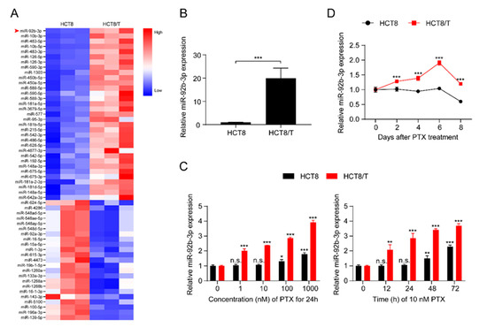 miR-92b-3p is highly expressed in HCT8/T cells and induced by PTX. (A) Heatmap of miRNAs expression profiling in HCT8 and HCT8/T cells measured. The red-white-blue color scale represents the normalized expression value of miRNAs: low expression (blue), medium expression (white), and high expression (red). (B) qRT-PCR analysis of relative expression levels of miR-92b-3p in HCT8 and HCT8/T cells. *** p < 0.001. (C) qRT-PCR analysis of relative expression levels of miR-92b-3p in HCT8 and HCT8/T cells treated with different concentrations of PTX for 24 h and 10 nM PTX for different time. versus cells without PTX treatment, respectively, n.s. p > 0.05; * p < 0.05; ** p < 0.01; *** p < 0.001. (D) qRT-PCR analysis of relative expression levels of miR-92b-3p in HCT8 and HCT8/T cells over time after treatment with 10 nM PTX for 72 h. versus HCT8 cells, *** p < 0.001. All experiments above were repeated three or more times independently and values are shown as mean ± SD.