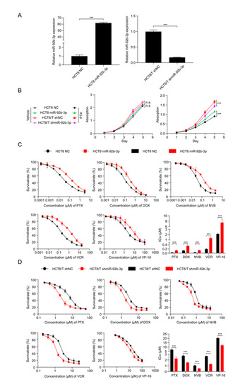 3.3. Overexpression of miR-92b-3p Desensitizes HCT8 Cells to Chemotherapeutic Drugs and Knockdown of miR-92b-3p Resensitizes HCT8/T Cells to Chemotherapeutic Drugs
