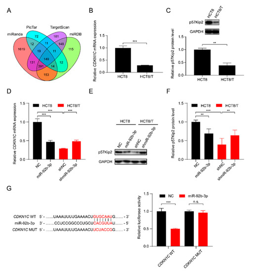 miR-92b-3p directly targets CDKN1C and suppresses its expression. (A) The potential target of miR-92b-3p by bioinformatics analysis (B,C) The p57Kip2 expression levels in HCT8 and HCT8/T cells by qRT-PCR and western blotting analysis. Detailed information about Western Blot can be found at Supplementary Materials. (D–F) The p57Kip2 expression levels in miR-92b-3p overexpressing HCT8 cells and miR-92b-3p knockdown HCT8/T cells by qRT-PCR and western blotting analysis. Detailed information about Western Blot can be found at Supplementary Materials. (G) Validation of the direct target of miR-92b-3p by dual luciferase reporter assay. Firefly luciferase and Renilla luciferase activities in 293/T cells after co-transfection with NC or miR-92b-3p and wild-type or mutant 3′ UTR of CDKN1C by dual luciferase reporter assay. All experiments above were repeated three or more times independently and values are shown as mean ± SD. n.s. p > 0.05; ** p < 0.01; *** p < 0.001.