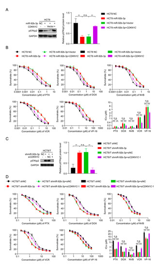 The following are available online at https://www.mdpi.com/article/10.3390/cancers13133323/s1, Figure S1: miR-92b-3p regulates the sensitivity of DLD1 cells to chemotherapeutic drugs by targeting CDKN1C, Figure S2: miR-92b-3p regulates the sensitivity of HT29 cells to chemotherapeutic drugs by targeting CDKN1C. Table S1: Primer sequences used for qRT-PCR, Table S2: The sensitivity of HCT8 and HCT8/T cells to chemotherapeutic drugs, Table S3: Overexpression of CDKN1C reverses the effect of miR-92b-3p overexpression on sensitivity of DLD1 cells to chemotherapeutic drugs, Table S4: Overexpression of CDKN1C reverses the effect of miR-92b-3p overexpression on sensitivity of HT29 cells to chemotherapeutic drugs. Origional Western Blot figures.