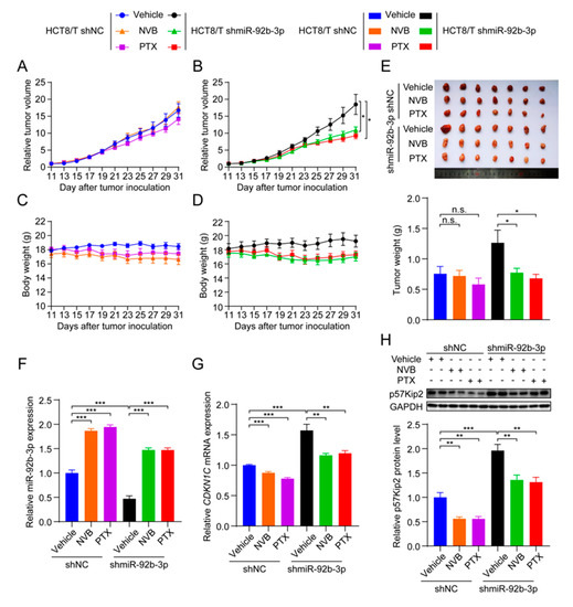 miR-92b-3p suppresses the sensitivity of HCT8/T xenograft tumors to chemotherapeutic drugs. Nude mice bearing CRC xenografts with HCT8/T control and miR-92b-3p knockdown cells were administered NVB (4 mg/kg) or PTX (20 mg/kg) by intraperitoneal injection every three days for 21 days and vehicle group mice received equal volume solvent. Tumor volume and body weight were recorded every two days. (A–D) The change in relative tumor volume and body weight over time. (E) The image and weight of the xenograft tumors at the end of treatments. (F) Relative miR-92b-3p expression levels in xenograft tumors evaluated by qRT-PCR. (G,H) The CDKN1C expression levels in xenograft tumors by qRT-PCR and western blotting analysis. Detailed information about Western Blot can be found at Supplementary Materials. n.s. p > 0.05; * p < 0.05; ** p < 0.01; *** p < 0.001.