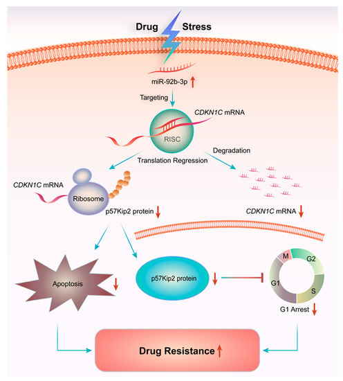 miR-92b-3p regulates chemotherapeutic drug resistance by targeting CDKN1C. Chemotherapeutic agents such as PTX could up-regulate the expression of miR-92b-3p, thereby inhibiting the expression of target gene CDKN1C, reducing cell cycle G1 arrest and apoptosis in chemotherapy, which promotes the increase of cell tolerance to chemotherapy drugs and multidrug resistance.