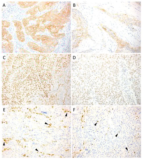 - Greco, A.; De Virgilio, A.; Rizzo, M.I.; Pandolfi, F.; Rosati, D.; de Vincentiis, M. The Prognostic Role of E-Cadherin and Β-Catenin Overexpression in Laryngeal Squamous Cell Carcinoma. Laryngoscope 2016, 126, E148–E155. [Google Scholar] [CrossRef]