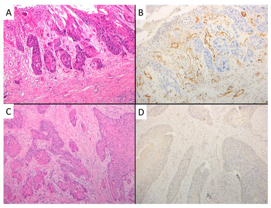 Representative cases with matched microvessel stain with CD105. (A) Squamous cell carcinoma with moderate differentiation and high MVD as shown by CD105 stain (B). (C) Squamous cell carcinoma with moderate differentiation and low MVD as shown by CD105 stain (D). A, C: Hematoxylin and eosin stain. A, B, C, D: Original magnification: 100×.