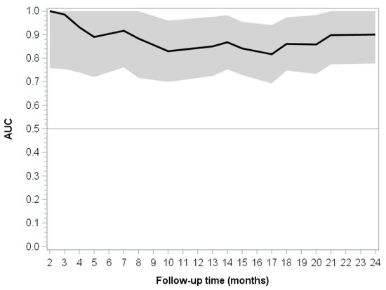 The integrated time-dependent area beneath the curve for the multivariate model was 0.8901 (see also Figure 3). Uno’s concordance statistics calculated for the multivariate model at different time points are summarized in Table 3. These results show that the predictive ability decreases as time passes, reaching a steady state at the end.