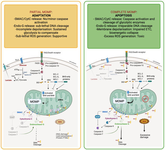 Cytochrome-c release during MOMP is thought to be biphasic; the release of a ‘loosely bound’ pool occurs first, with an amplification loop and mitochondrial cristae remodelling then triggering release of the more tightly bound pool [34,35]. The loosely bound ‘soluble’ cytochrome-c pool is that which is responsible for electron transport and ROS management, i.e., serves a critical role in mitochondrial oxidative phosphorylation and ATP generation, but interestingly these processes are not significantly interrupted until the second wave of cytochrome-c is released, suggesting metabolic compensation is possible during incomplete MOMP. The ‘tightly bound’ pool also interacts with cardiolipin (CL), facilitating cytochrome-c association with mitochondrial membranes. Amplification following the first wave can promote CL oxidation and subsequent dissociation from cytochrome-c, caspase activation and resultant cleavage of essential components of ETC complexes, which potentiates further ROS generation and respiratory collapse [34]. Ricci et al., revealed that following cytochrome-c release caspase-3 cleaves the p75 subunit (NDUFS1) of Complex I, resulting in further loss of mitochondrial membrane potential and mitochondrial integrity, production of ROS, plasma membrane damage and a fatal drop in ATP levels [36]. Therefore, levels of cytochrome-c release will dictate not only the levels of oxidative metabolism and ATP generation, but also apoptotic engagement, demonstrating that levels of MOMP are vital in modulating balance of metabolic and apoptotic responses to cellular stress. The processes and consequences of partial and complete MOMP are demonstrated in Figure 2.