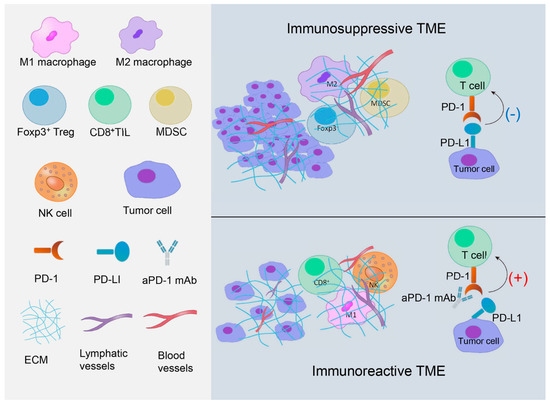 Immunosuppressive and immunoreactive TME. Immunosuppressive tumor microenvironment (TME) is mainly constituted of M2 macrophages, forkhead box P3+ (Foxp3+) regulatory T lymphocytes (Tregs), myeloid-derived suppressor cells (MDSCs), and PD-1/PD-L1 axis. Immunoreactive TME is mainly constituted of CD8+ T cells, natural killer (NK) cells, and M1 macrophages. PD-1/PD-L1 axis becomes immunoreactive in response to anti-PD1 or anti-PD-L1 monoclonal antibody (aPD-1/PD-L1 mAb) owing to the activation of CD8+ T cells. (Foxp3, forkhead box P3; Tregs, regulatory T lymphocytes; MDSC, myeloid-derived suppressor cell; NK, natural killer; PD-1, programmed cell death protein-1; PD-L1, programmed death-ligand 1; aPD-1 mAb, anti-PD-1 monoclonal antibody; ECM, extra cellular matrix; TME, tumor microenvironment).