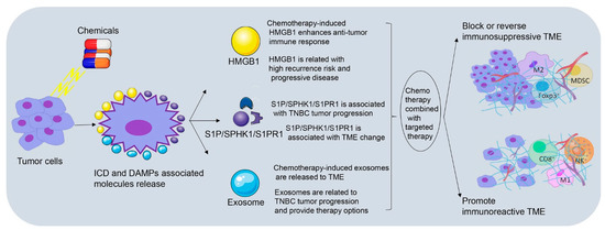 It has been reported that cytotoxic drugs such as anthracycline and platinum agents, could induce immunogenic cell death (ICD), and stimulate anti-tumor immune response of T lymphocytes [18,129]. Damage-associated molecular patterns (DAMPs) are cytokines that are released by damaged or activated cells; have great immune stimulating response, and cause ICD [18]. ICD involves the cell surface exposure of calreticulin (CRT), release of DAMPs-related high mobility group box1 (HMGB1) and autophagy-dependent ATP release, which together, leads to the antigen uptake and presentation of DC cell, and then activates the CD8+ TILs to play the anti-tumor role [130,131]. Carboplatin or paclitaxel combined with radiation generates both chemotherapeutic enhancement of ICD and a dose-dependent induction of ICD in TSA mammary carcinoma cells [132]. Doxorubicin and paclitaxel treatment results in the recruitment of innate immune cells and CSF1R-dependent macrophages infiltration in PyMT-MMTV mammary carcinoma through an increase of CCL2, CXCL2, CSF-1, interleukin-34 and vascular permeability [133,134]. Docetaxel polarizes MDSCs toward M1-like phenotype and upregulates macrophages markers (CD86, MHC class II, and CD11c) in vivo and in vitro partly through an inhibition of STAT-3 in 4T1-Neu mammary cancer implants [135]. All these studies emphasize that chemotherapy can induce TME remodeling through distinct signaling pathways. In this part, we have focused on three crucial factors related to chemotherapy-induced TME remodeling, which are HMGB1, exosomes and S1PR1. The clinical significance of HMGB1, exosomes and S1P/SPHK1/S1PR1 as well as their involvement in TNBC immunomodulation and tumor progression is shown in Figure 2.