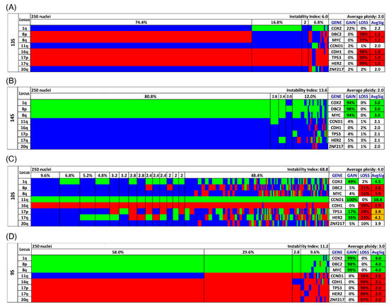 Gain and loss patterns were established in relation to the assessed ploidy of the respective nucleus and visualized in a color chart for each case (Figure 2A–D, Figure 3D,H and Figure 4D,H, Figures S1 and S2). Copy number alterations (CNAs), defined as somatic changes to chromosome number that result in gains or losses in copies of DNA-sections being prevalent in many cancer types [28], were considered for statistical analyses only when the respective aberration occurred in at least 15% of the cell population (Figure 1C, Figures S3C and S4C, Tables S5–S7).