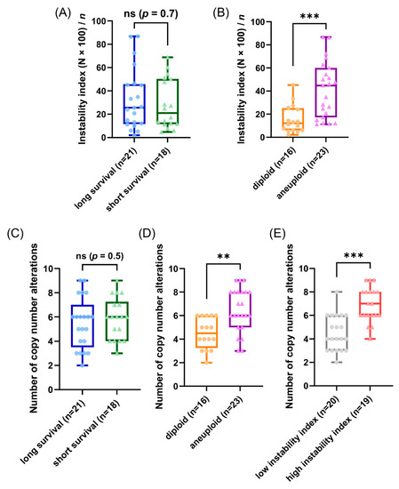 Results of the miFISH analysis presenting instability indices, calculated as described in Section 2, and frequencies of CNAs per tumor sample for different subgroups. (A,B) Instability indices including minimum, maximum, median and outliners are presented as a boxplot for each subgroup: (A) long and short survival and (B) diploid versus aneuploid tumors. Note the significant difference between diploid versus aneuploid tumors (p = 0.0006). (C–E) Frequency of CNAs per tumor sample including minimum, maximum, median and outliners are presented as a boxplot for each subgroup: (C) long and short survival, (D) diploid versus aneuploid tumors and (E) tumors with low versus high instability index. Note the significant difference between diploid versus aneuploid tumors (p = 0.0012) and between tumors with low versus high instability index (p ≤ 0.0001); ** p ≤ 0.01; *** p ≤ 0.001.